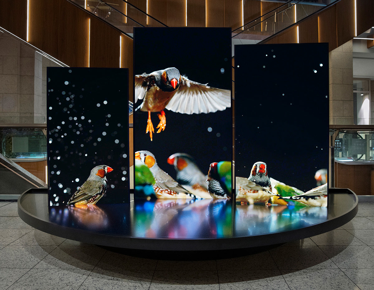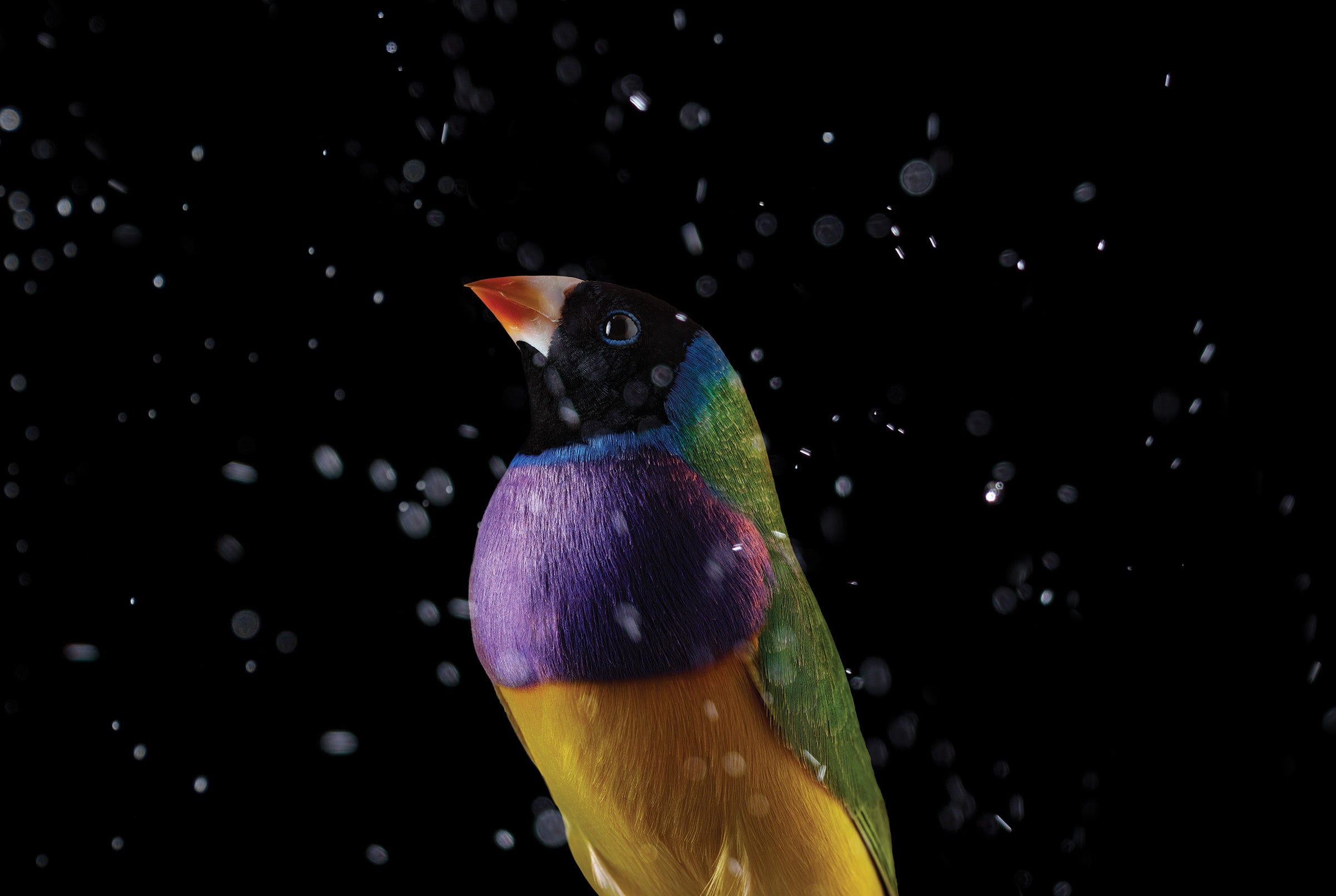 Filmed at Taronga Zoo’s Living Classrooms, which were built especially to inspire and educate the next generation of conservation scientists, the work hopes to reveal the beauty of the critically endangered Gouldian finch and its cousin the Zebra finch. These birds have wildly different circumstances. The Gouldian Finch whose home is in tropical northern sub coastal areas of Australia, is critically endangered whereas the Zebra finch, one of our more common finches flourishes and is found in most parts of Australia.